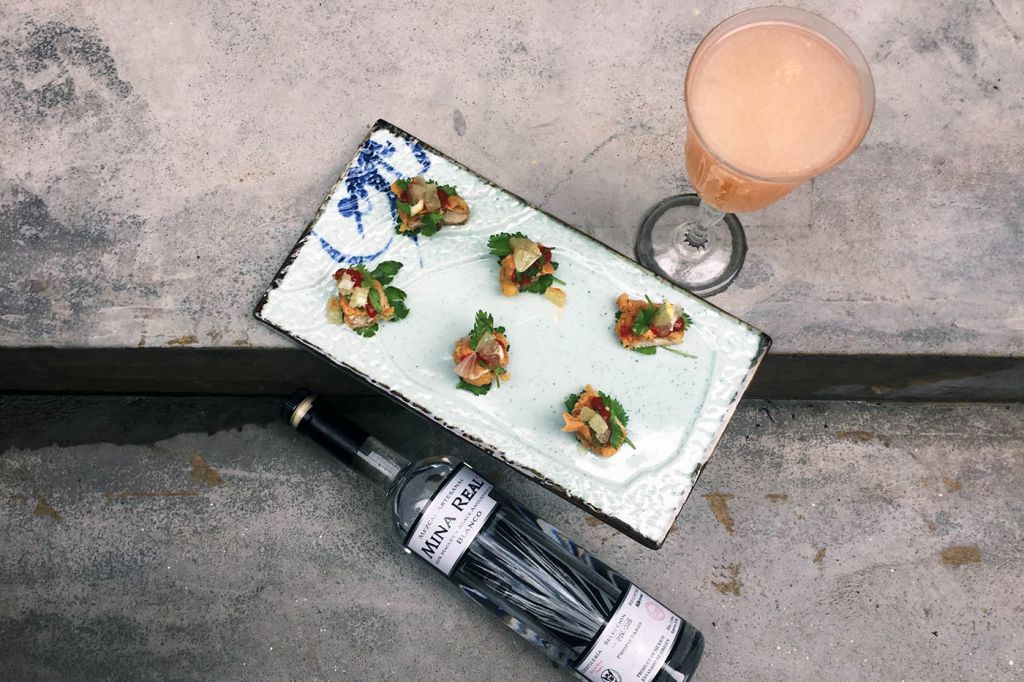搖勻后濾入雞尾酒杯,配上炸雞,佐以花生黃油、是拉差甜辣醬(sriracha)、檸檬醬和香菜。