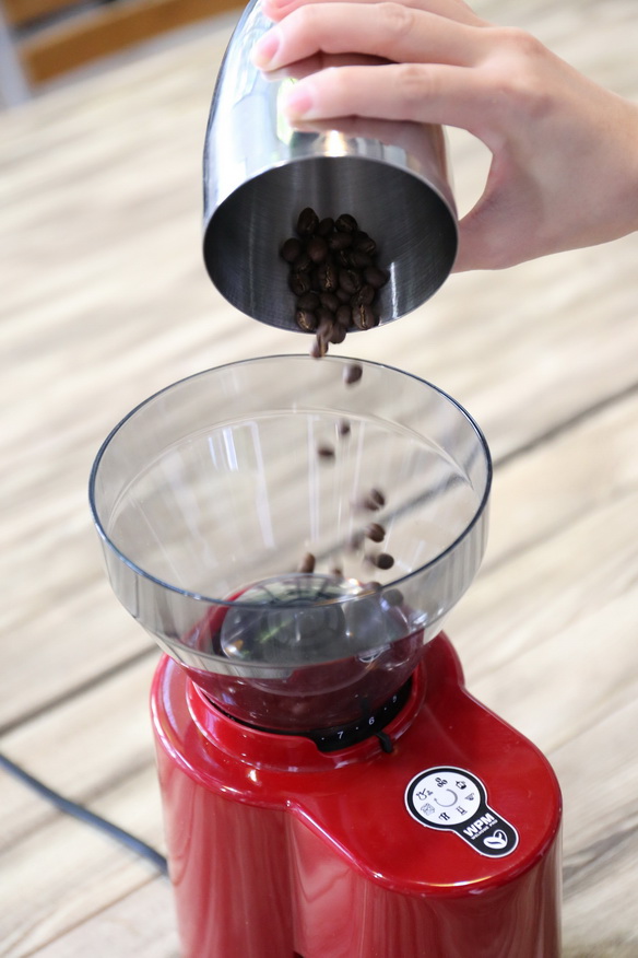 量取40g咖啡豆備用,再取少量咖啡豆測試研磨機研磨度。調(diào)整到磨出的咖啡粉與砂糖大致相近。再將40g咖啡豆研磨成粉。