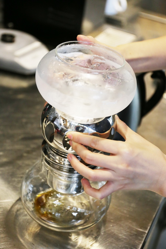 把冰滴壺組裝好。旋轉(zhuǎn)閥門桿可以調(diào)節(jié)冰水滴速。滴速過快可能造成萃取不足,缺乏風(fēng)味。過慢會造成萃取過度,可能導(dǎo)致苦味和澀味的出現(xiàn)。這次我們用的滴速是1分鐘40滴,大概3秒2滴。