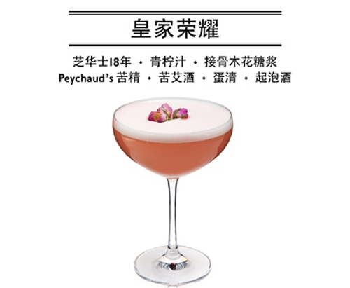 隨著玫瑰花蕾氤氳開來的是威士忌隱隱的芬芳花香,原本的濃烈不羈被接骨木花糖漿和起泡酒柔化開去。皇家榮耀是一款優(yōu)雅而嬌美的雞尾酒。