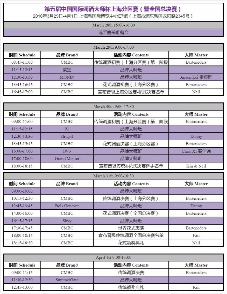 以上日程包含英式調酒、花式調酒、Master Class三個大環節,具體時間以現場為準